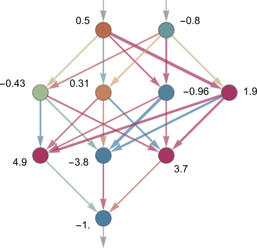 Training the model is largely about messing with these weights until we get a close approximation of the function we want. As it happens, sufficiently large networks of math neurons (like the one pictured) can do lots of really cool things, like replicate the above function and identify a picture of Stephen Hawking.