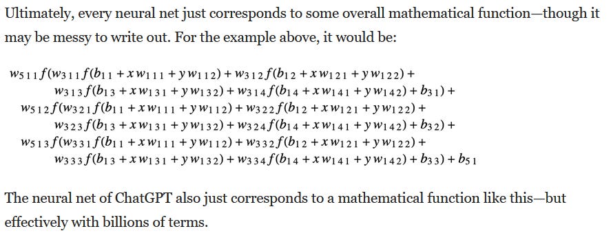 You often hear about ChatGPT’s “weights.” Each neuron can be treated like a function that uses a weighted average of the form weight1*input1 + weight2*input2 + … and so on. From Wolfram’s post:
