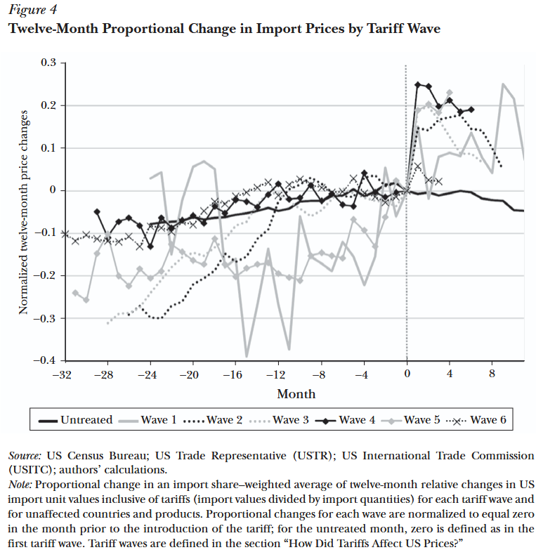 Consider this chart of import prices, where month 0 indicates the point in time when tariffs were implemented. The sudden jump in prices at that point could only be caused by the tariffs. It directly implies that Americans were paying more for tariffed goods, since they would simply not pay the higher import price if they could get these goods for the same price from American firms.